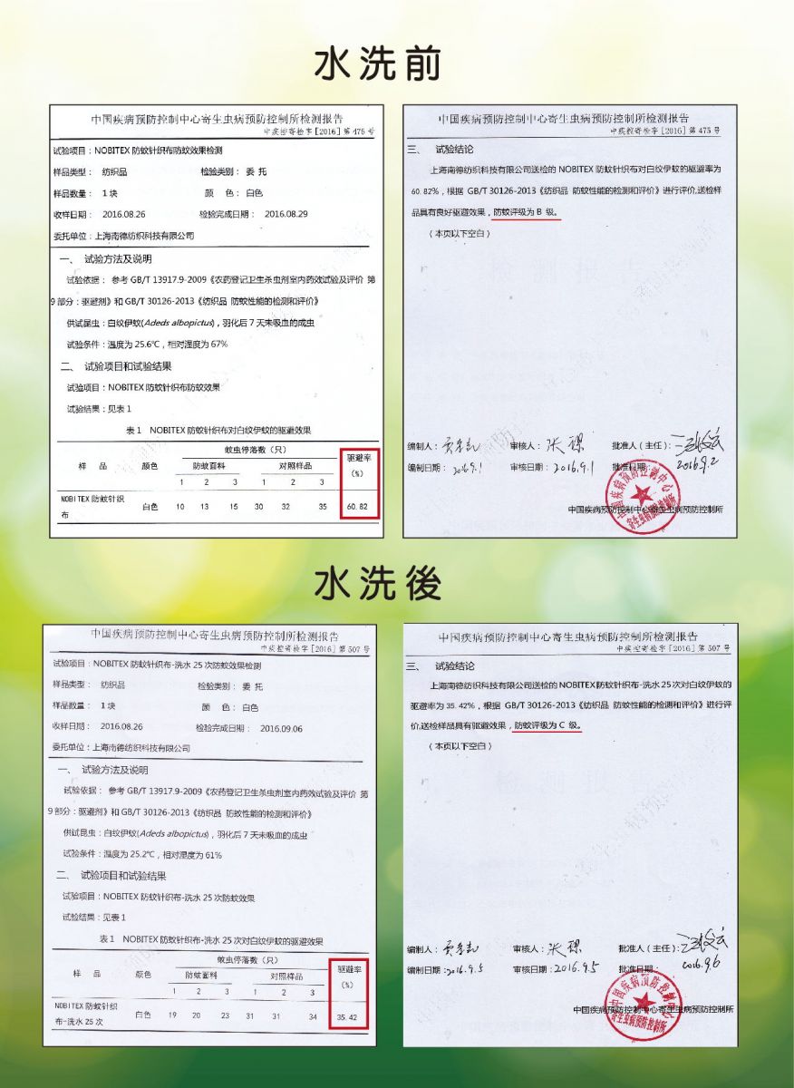 試驗證明NOBITEX奈米原料所制成的織物,其抵抗水洗及摩擦的性能比其它市售防蚊液強。